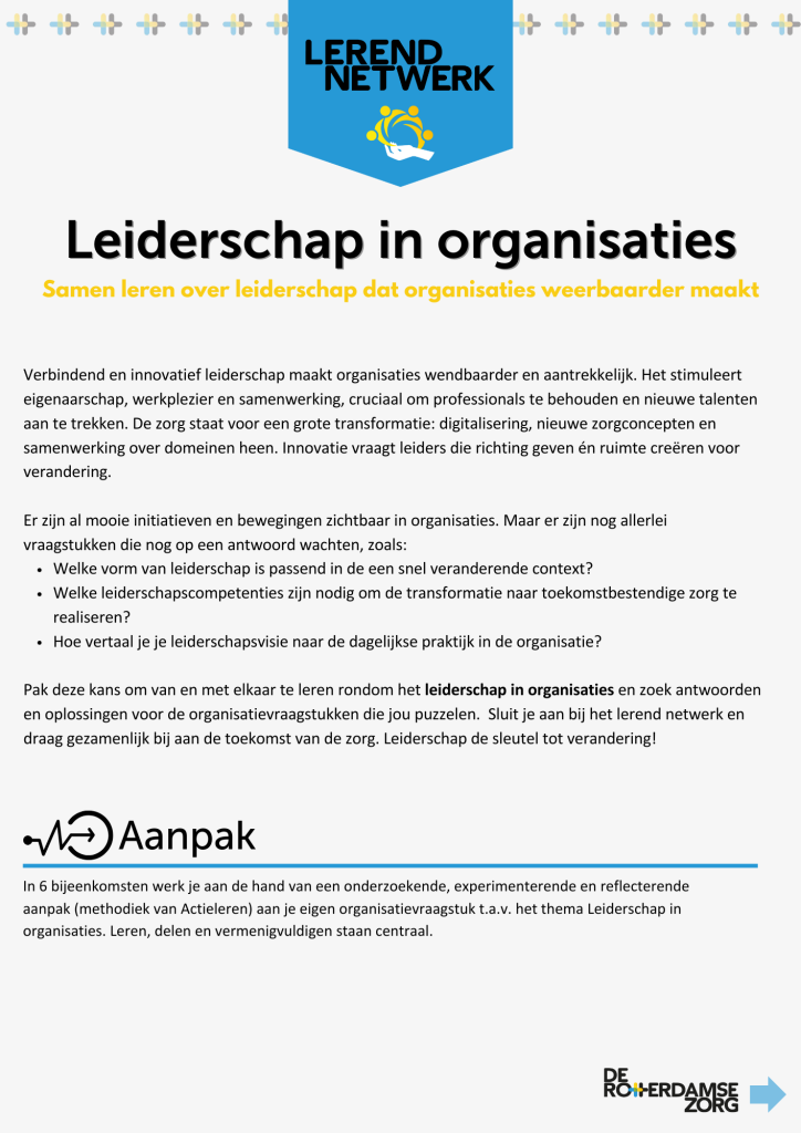 Ben jij enthousiast om in je in te zetten binnen dit actiegerichte netwerk en draag jij daarmee bij aan het versterken van leiderschap binnen jouw organisatie? Lees onderstaande flyer voor meer informatie en meld je aan!