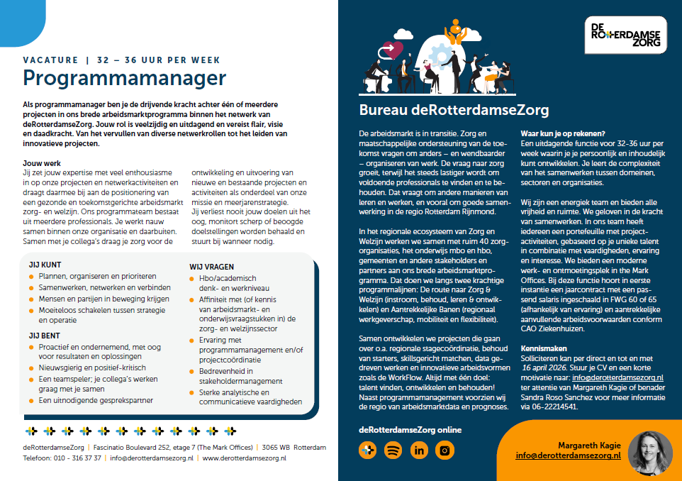 Solliciteren kan per direct en tot en met 16 april 2026. Stuur je CV en een korte motivatie naar: info@derotterdamsezorg.nl ter attentie van Margareth Kagie.