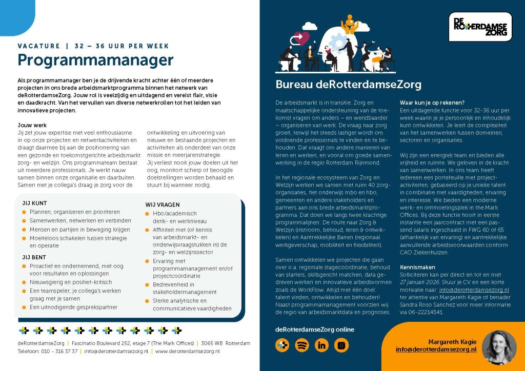 Solliciteren kan per direct en tot en met 27 januari 2026. Stuur je CV en een korte motivatie naar: info@derotterdamsezorg.nl ter attentie van Margareth Kagie of benader Sandra Roso Sanchez voor meer informatie via 06-22214541.