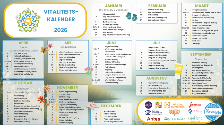 Geef jij in 2026 prioriteit aan vitaliteit? Maak gebruik van de vitaliteitskalender. Vanuit de deelnemers van het lerend netwerk Vitaliteit is een vitaliteitskalender ontwikkeld voor 2026. De verschillende belangrijke dagen, momenten en maanden zijn eruit gelicht waarop je iets op maat kunt organiseren in je organisatie of team. Kleine acties, groot effect, het hele jaar door aandacht voor vitaliteit en werkplezier!