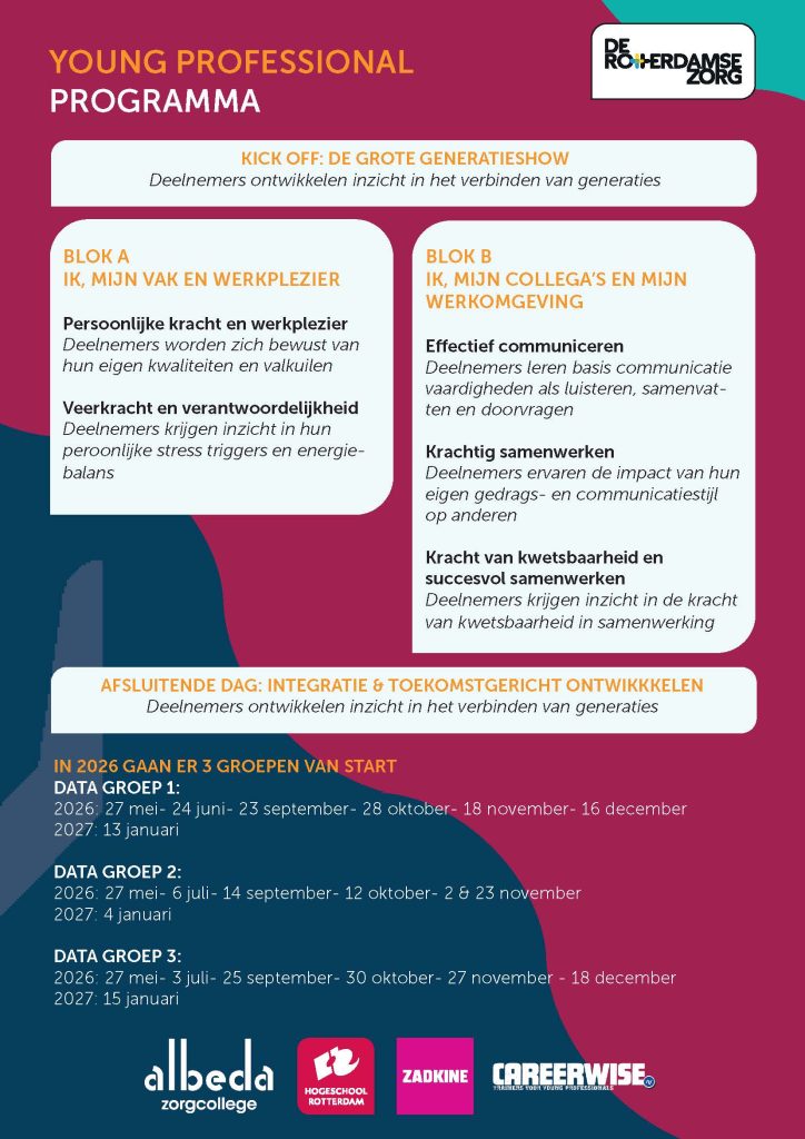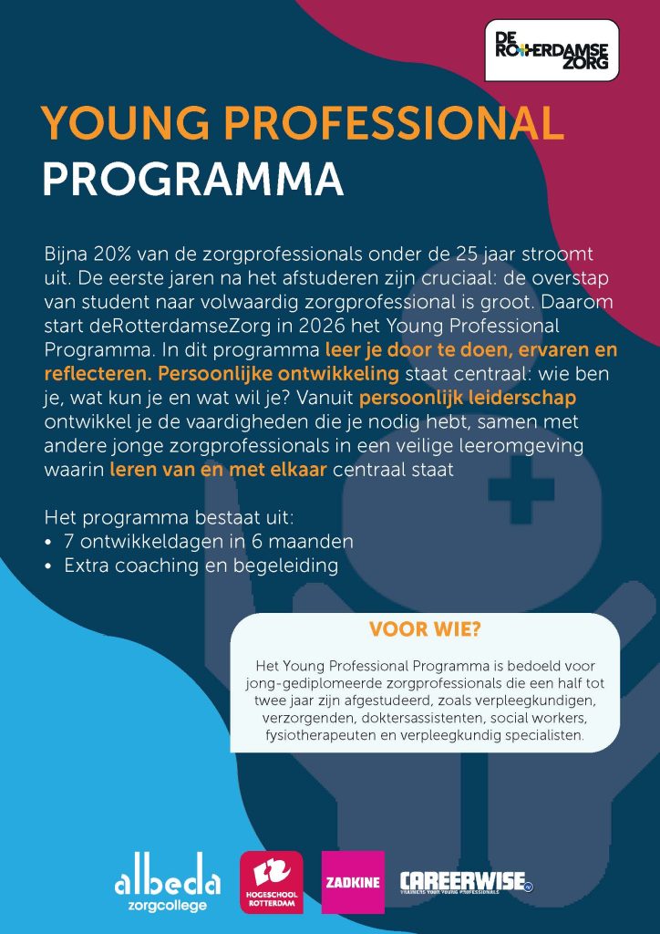 Bijna 20% van de zorgprofessionals onder de 25 jaar stroomt uit. De eerste jaren na het afstuderen zijn cruciaal: de overstap van student naar volwaardig zorgprofessional is groot. Daarom start deRotterdamseZorg in 2026 het Young Professional Programma. In dit programma leer je door te doen, ervaren en reflecteren. Persoonlijke ontwikkeling staat centraal: wie ben je, wat kun je en wat wil je? Vanuit persoonlijk leiderschap ontwikkel je de vaardigheden die je nodig hebt, samen met andere jonge zorgprofessionals in een veilige leeromgeving waarin leren van en met elkaar centraal staat.